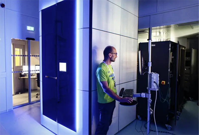During 2024, a custom built room for the microscope was constructed in the SOLEIL experimental area. Much effort was spent in ensuring a suitable environment for the KRIOS, including electromagnetic field correction (to ensure that the microscope can operate independently to the synchrotron operation), very high temperature stability with very low cooling air flow rates (± 0.1 ° over 24 hours operation, with flow rates close to the microscope around 0.15 m s-1), and excellent vibrational stability ensure by the experimental hall floor of SOLEIL. Site tests on apo-ferritin, the protein regularly used as a standard for benchmarking microscope performance, see for example Stark et al, Nature 587 (2020), yielded 1.14 Angstrom resolution, hence demonstrating the high stability of the microscope environment.